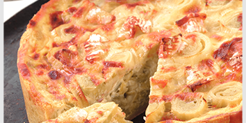 Em seguida coloque o Brie Isigny Ste Mère cortado em cubos. Asse a torta em forno a 180ºC. Ao retirar do forno, deixe descansar e corte em fatias. A cada fatia adicione o creme de cebolinha ou sirva separadamente em uma molheira.